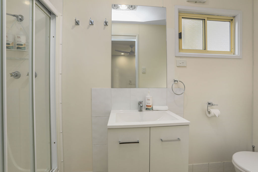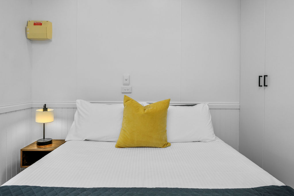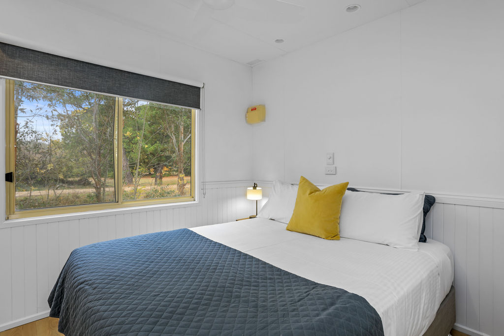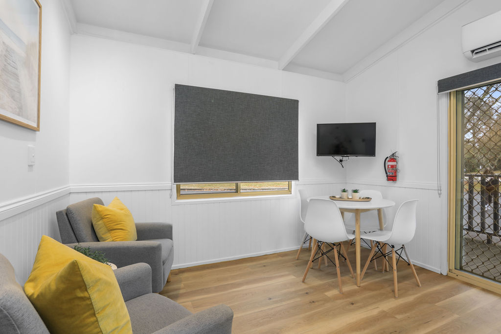 A spacious cabin with a separate bedroom to the living area, full-sized fridge and private deck.